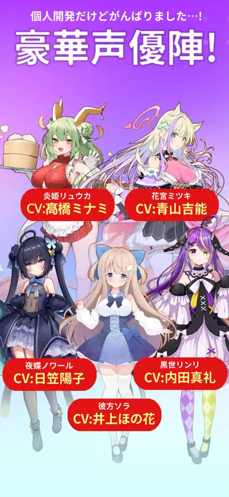 • 「個人開発とは思えないくらいキャラクターがかわいく、推しを見つける楽しさがある」という声が多いです。特にLive2Dのような動きはないものの、イラストの密度と表情差分が魅力的。
