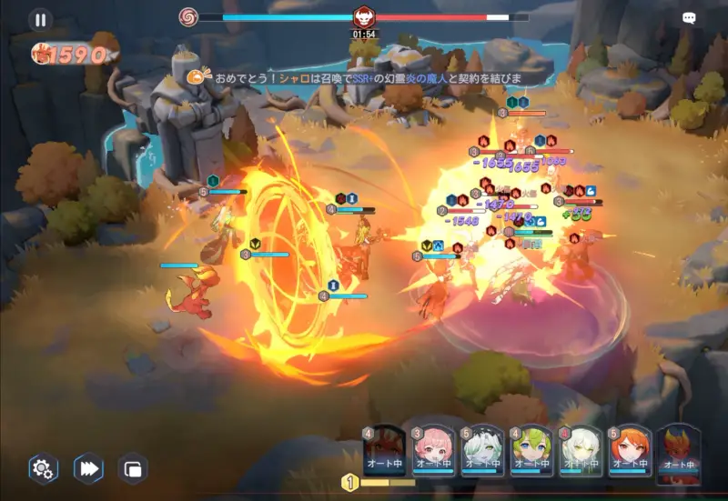 1つ目は、「スキルの方向指定」です。マニュアル操作時にはスキルの発動タイミングだけでなく、射出する方向も自由に調整可能。「奥にいる厄介な回復役を先に仕留めたい!」「敵が固まっている場所に範囲攻撃をぶち込みたい!」といった、プレイヤーの意思をダイレクトに反映できるため、戦略的な楽しさがしっかりと確保されています。