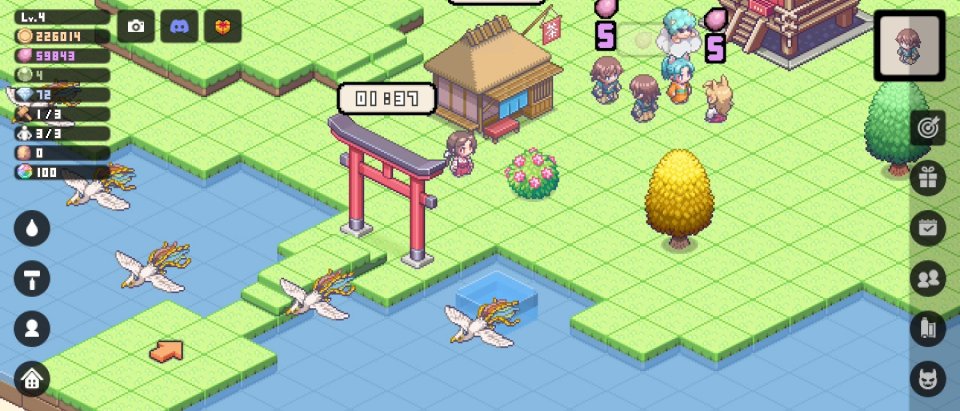 一方、戦闘や放置で得たアイテムを使って、自分だけの神社を自由にデザイン可能。階段や滝、さらには物理法則を無視した「空中神社」まで作れるなど、創造力を激しく刺激される街づくり要素が最大の魅力です。放置収益で資金を貯め、さらに豪華な神社へとアップグレードしていく、止めどないサイクルが楽しめます。