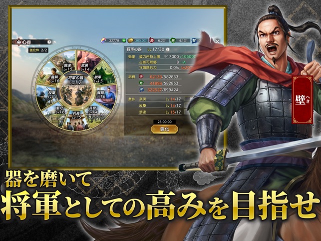 - 内政システム:一般的な城レベルアップだけでなく、「心得」を強化して部隊の基礎能力を底上げする独自システム