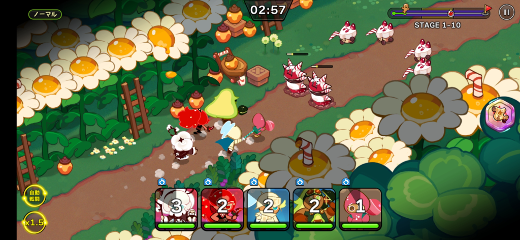 通常攻撃は全自動なので、プレーヤーは各クッキーのアイコンをタッチしてスキルを発動するのみ!!