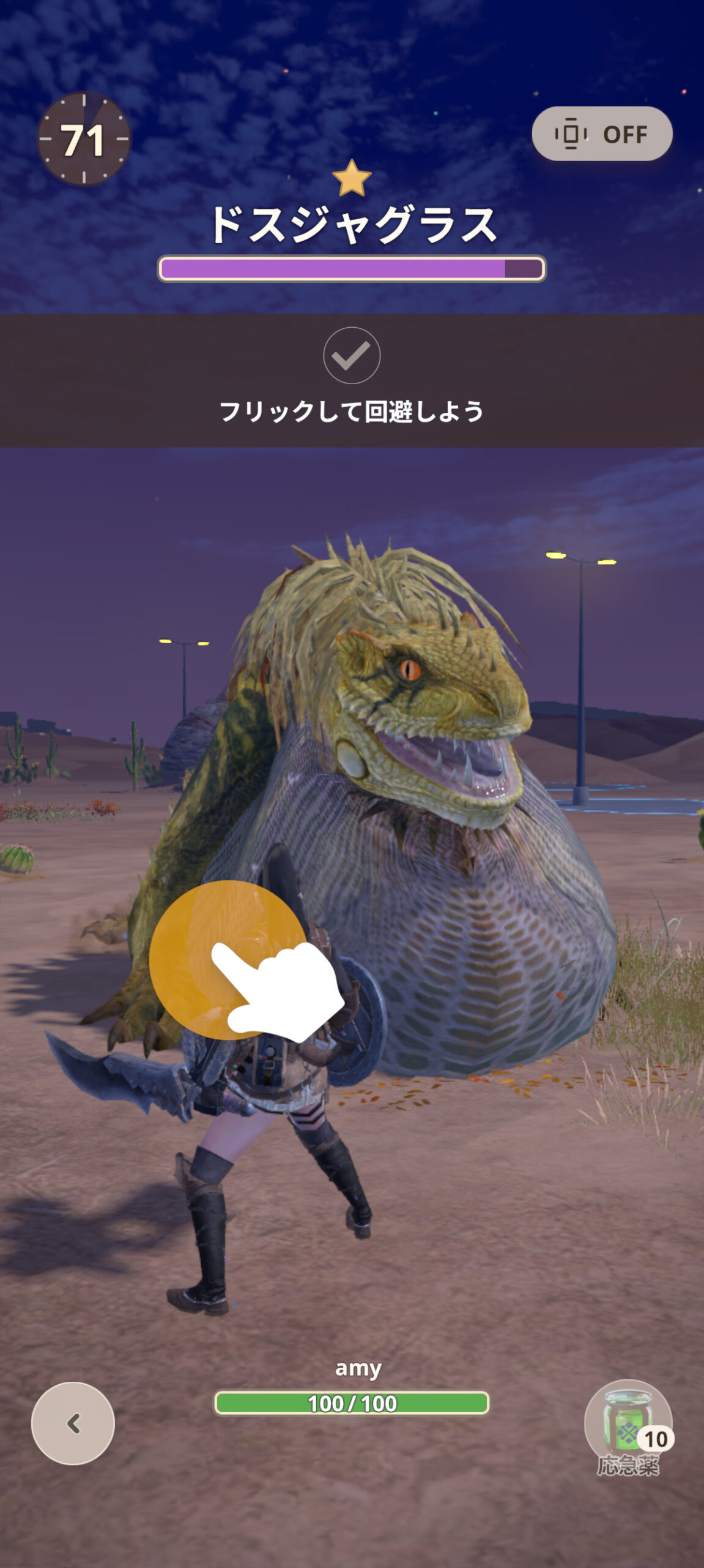 基本操作は、画面をタップして攻撃、左右上下にフリックして回避。モンスターの体が赤く光ったら攻撃の予兆です!絶妙なタイミングで回避すると「ジャスト回避」が発動し、強力な反撃を叩き込むことができます。さらに、画面下のゲージが溜まれば、派手な演出と共に超強力な「SPスキル」を放てます!