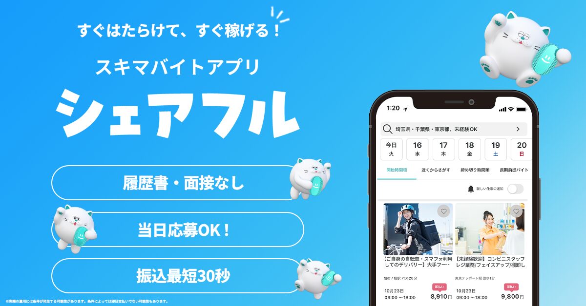 そこで活躍してくれるのが、スキマ時間に働ける単発バイトアプリ『シェアフル』です。スマホさえあれば面接や履歴書なしでサクッと応募でき、その日のうちに働ける手軽さから、多くのユーザーに利用されていますよ。